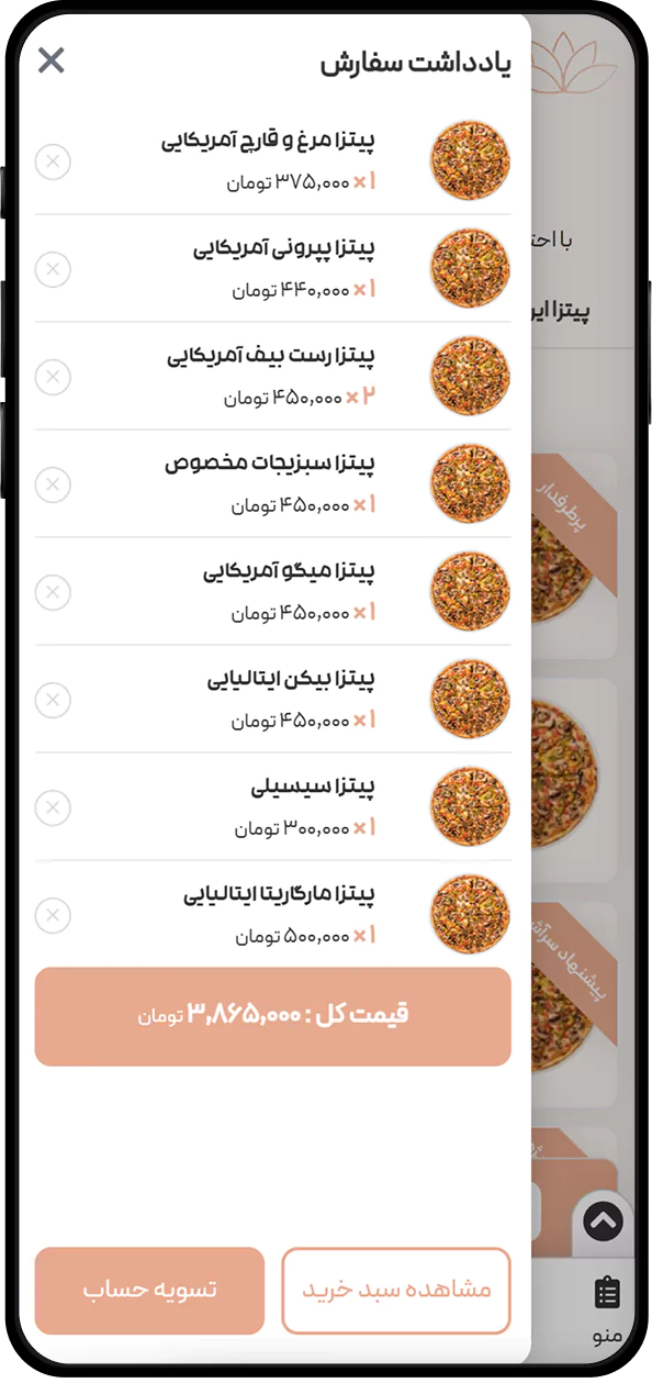 منوی آنلاین، نسخه دیجیتالی و آنلاین منو فیزیکی مجموعه شماست. مشتریان شما می‌تونن از طریق دوربین گوشی همراهشون QRCode رو اسکن یا آدرس منو در مرورگرشان را وارد کنند و به منوی شما دسترسی پیدا کنند. شما می‌تونید این QRCode یا آدرس منو رو به دیوار بچسبونید یا روی میزای مجموعتون بذارید.